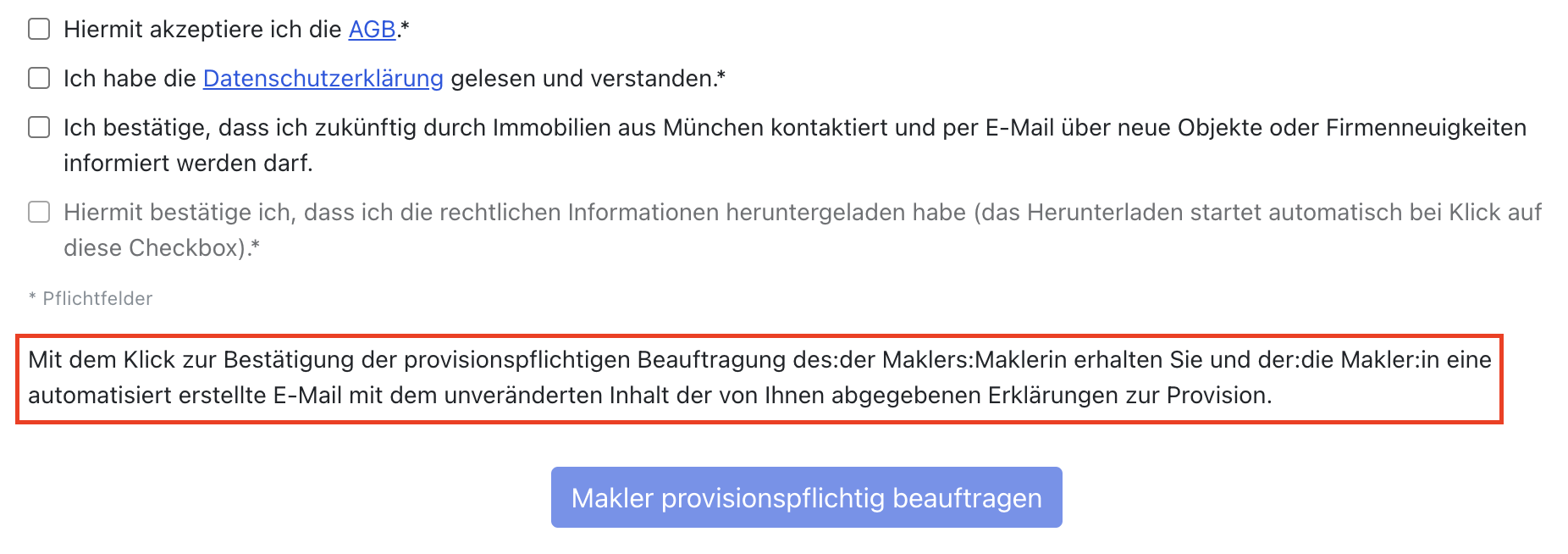 Wir haben unser Rechtsformular für Exposés verbessert, um Eure rechtliche Sicherheit als Makler zu erhöhen. Ab sofort wird unter den Checkboxen im Formular ein wichtiger Hinweis angezeigt, der transparent macht, dass nach der Bestätigung des Buttons durch Eure Interessenten automatisch eine E-Mail mit den unveränderten Inhalten der Erklärungen an beide Parteien gesendet wird. Diese Dokumentation dient als zusätzlicher Nachweis und stärkt Eure Position bei möglichen Rechtsstreitigkeiten.