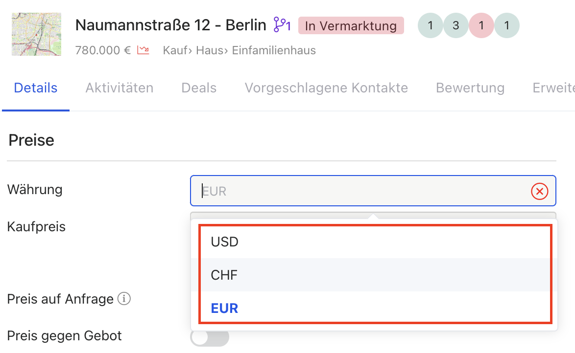 Wir haben Propstack um die Unterstützung verschiedener Währungen und Flächeneinheiten erweitert. Diese neue Funktion ermöglicht es Euch, Immobilien aus unterschiedlichen Ländern in ihren originalen Währungen (wie Euro, US-Dollar oder Schweizer Franken) und Flächeneinheiten (Quadratmeter oder Quadratfuß) zu verwalten.