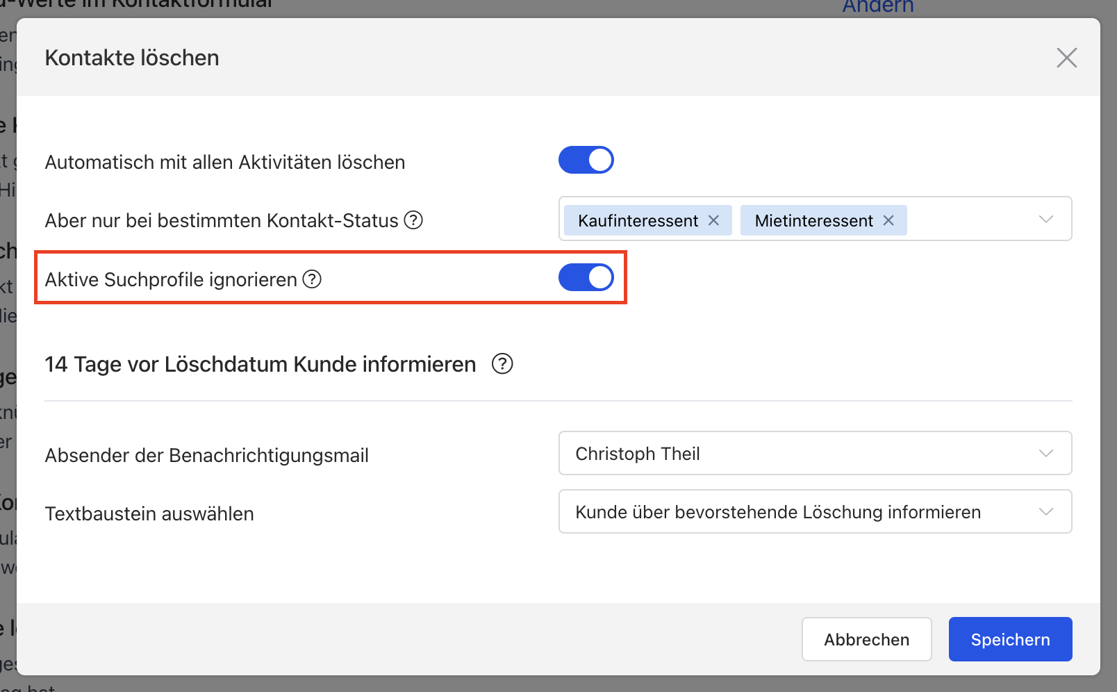 Automatische Kontaktlöschung nun auch mit aktiven Suchprofilen möglich