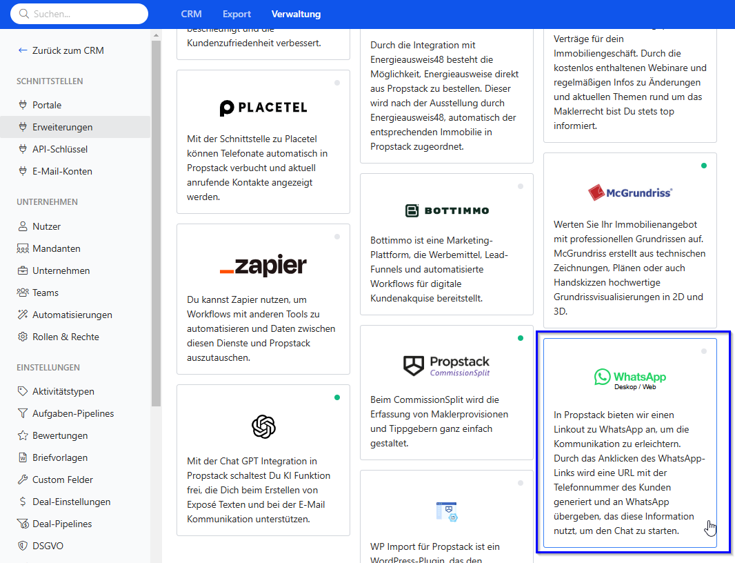 Ab sofort könnt Ihr mit der WhatsApp-Erweiterung direkt aus Propstack Nachrichten und Telefonate in WhatsApp-Web starten. Aktiviert die Funktion schnell und einfach über das Menü Verwaltung > Erweiterungen > WhatsApp. Weitere Details zur Nutzung und hilfreiche Tipps findet Ihr in unserem ausführlichen Artikel.