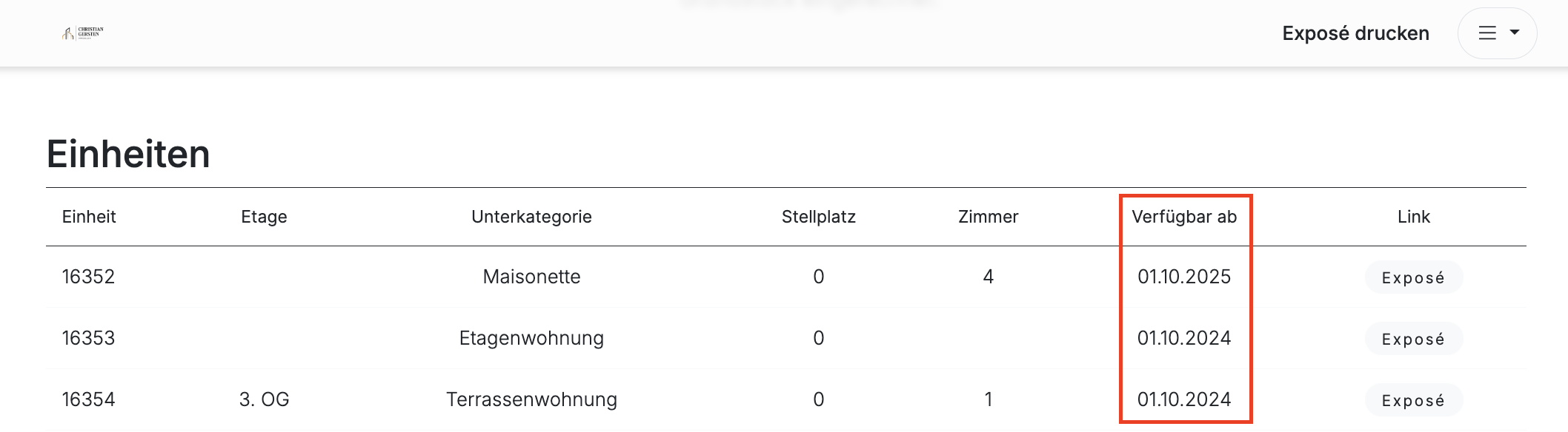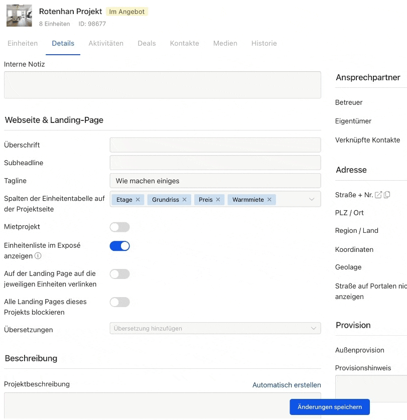 Ihr könnt nun das Feld „Verfügbar ab“ auf Euren Projekt-Landingpages anzeigen lassen. Dieses Feld ist besonders nützlich, wenn Einheiten eines Projekts erst zu einem späteren Zeitpunkt verfügbar sind.