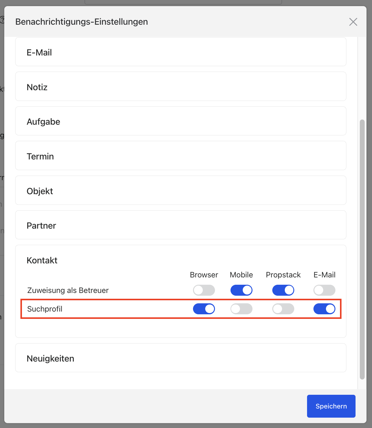 Ab sofort könnt Ihr in den Benachrichtigungseinstellungen festlegen, ob Ihr Benachrichtigungen für Suchprofile erhalten möchtet oder nicht. Unter Verwaltung > Nutzer > Benachrichtigungseinstellungen > Kontakte in eurem jeweiligen Nutzerprofil gibt es jetzt einen neuen Abschnitt „Suchprofile“, wo Ihr die Benachrichtigungen ganz einfach ein- oder ausschalten könnt.
